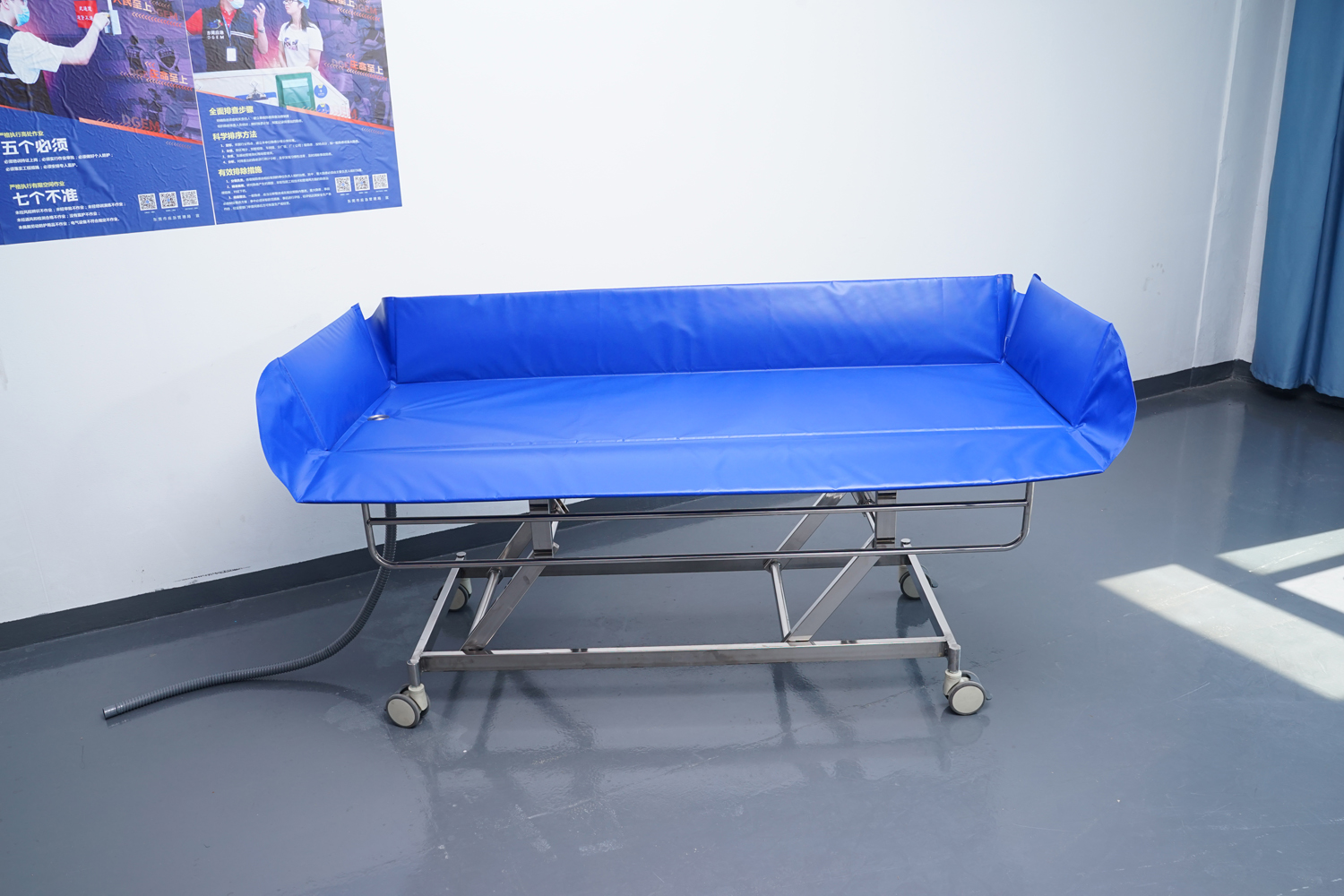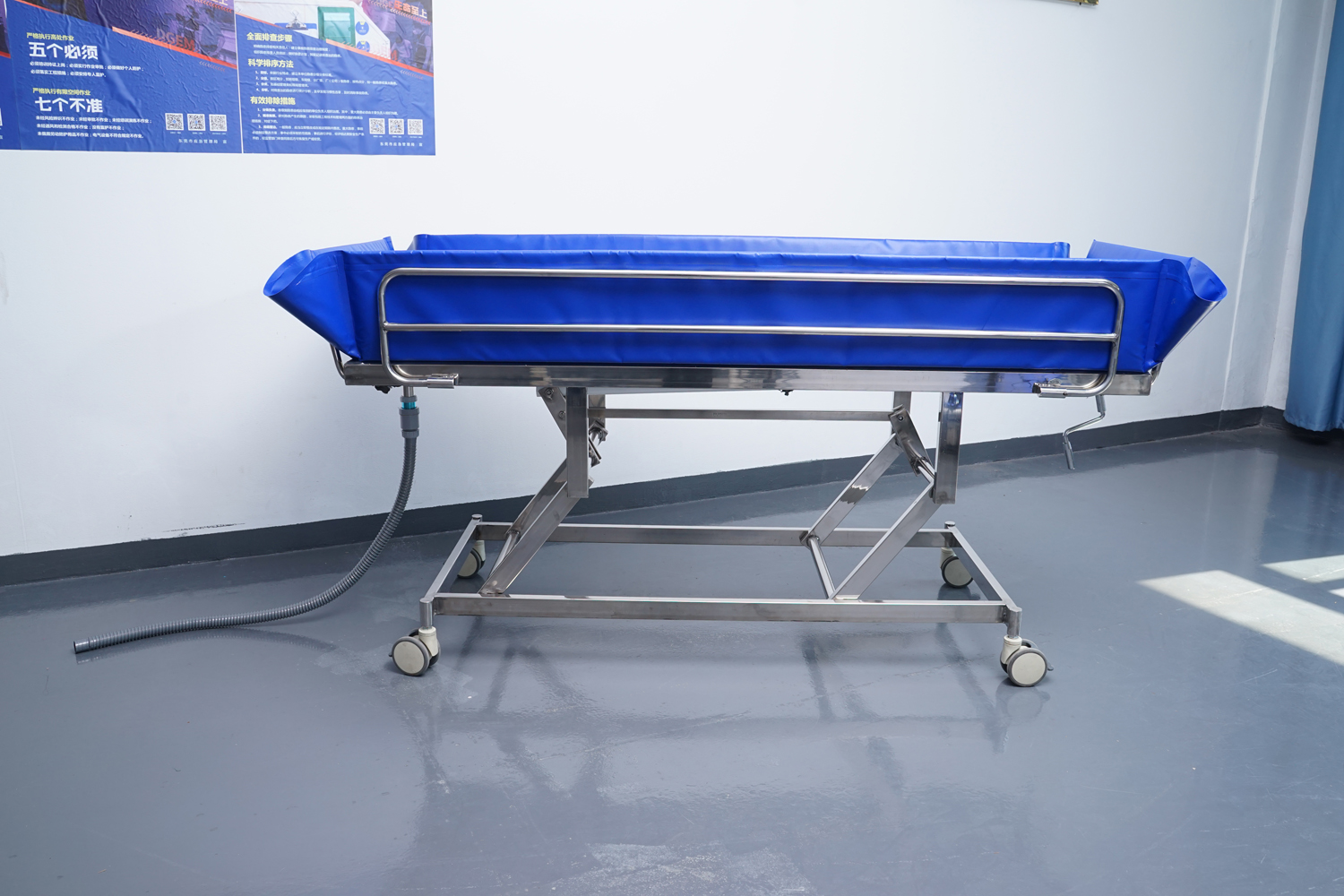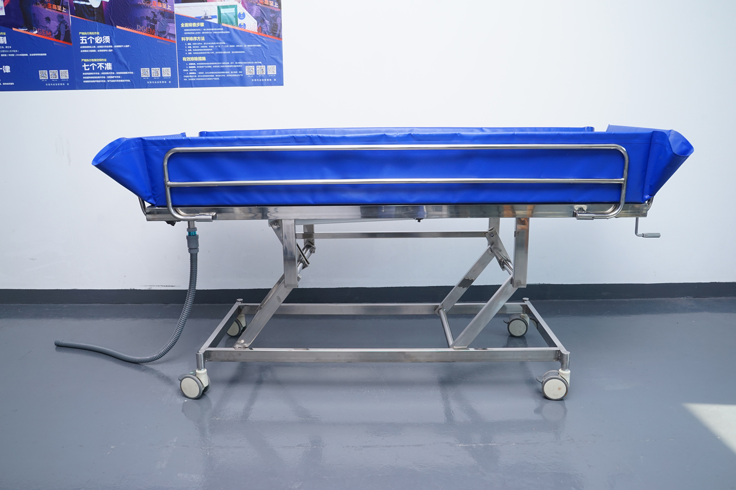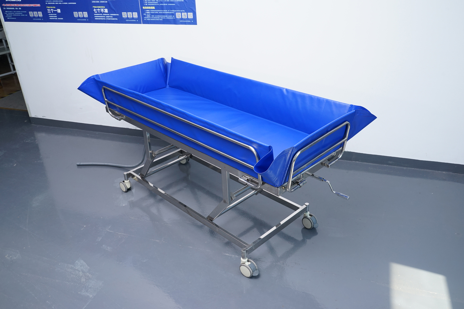 二、規(guī)格參數 1、床架:高級304#不銹鋼材質。 2、浴槽:采用高韌性環(huán)保聚氯乙烯制成,墊內夾高密度EVA;柔軟舒適,耐高溫/嚴寒(+80°-10°),不易變型,不易老化;可拆下清潔消毒。 3、尺寸:長1860mm寬650mm高550~900mm(±5%)。 4、操作: 手搖升降。 5、承重:≦130kg。 6、護欄:護欄高270mm,四周護欄皆可180°旋轉,能直接由睡床轉移洗澡者前往沐浴;易于洗澡者移動搬運。 7、排水:床體整體傾斜1°,既床頭比床尾高3cm,順暢排水;護欄向外傾斜13度。 8、腳輪/零配件:高級防護萬向剎車輪,移動方便,操作簡單,性能可靠。床架零件均采用304加厚不銹鋼材質。 9、配件:軟枕1個,不銹鋼雙層排水軟喉管1條。