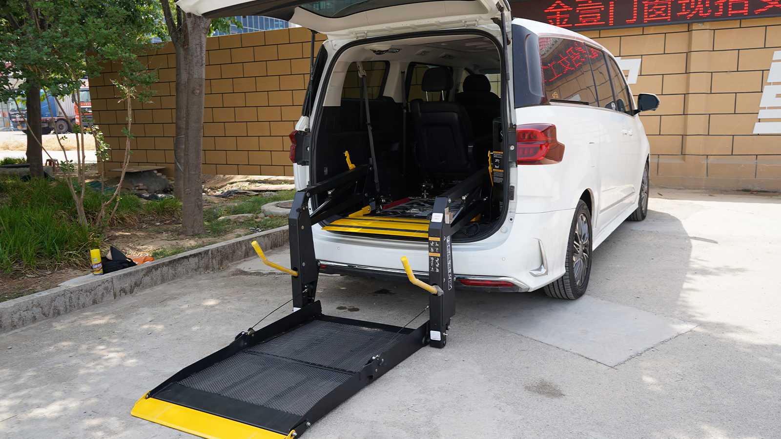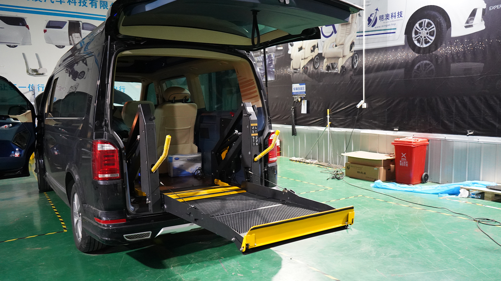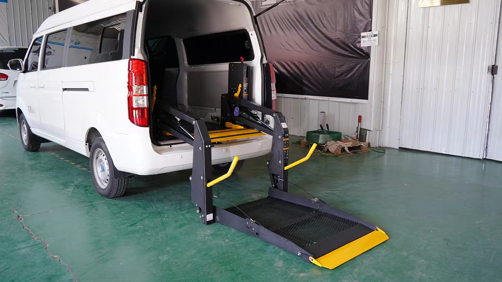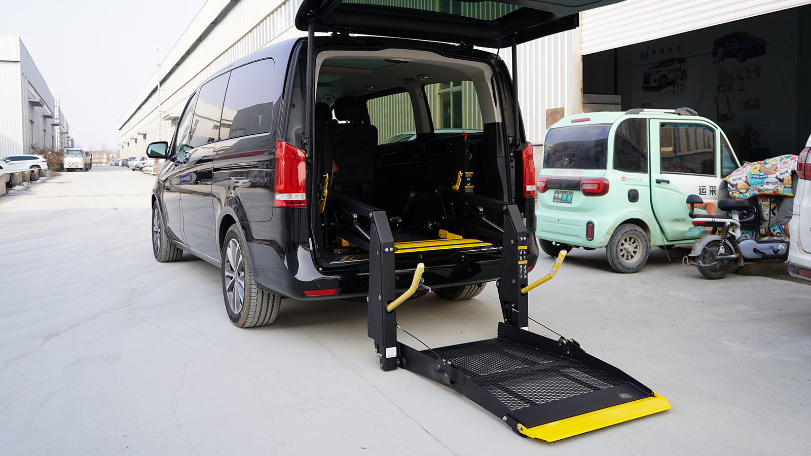 A welfare car designed specifically for special groups using business models as a carrier, equipped with a wheelchair lift that allows people with limited mobility to freely get on and off the vehicle. It is intelligently controlled by a remote control handle, and the lifting process is smooth and noiseless, effectively solving the problem of getting on and off the vehicle for people with disabilities, inconvenience in legs and feet, etc. The wheelchair lift completely solves the problem of getting on and off the vehicle by using methods such as mixing, supporting, holding, and carrying.