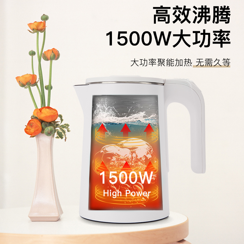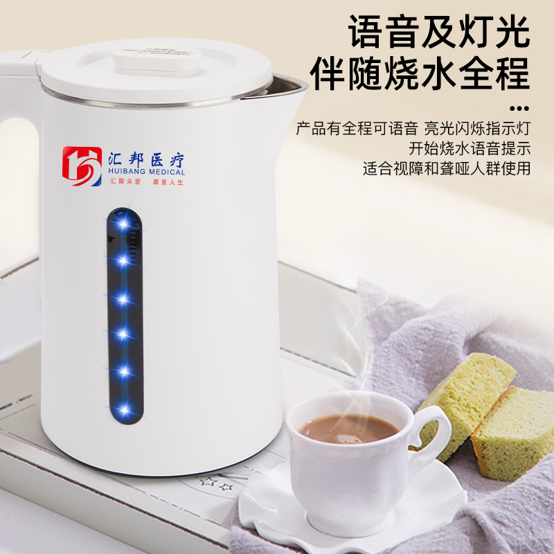 產(chǎn)品由壺身主機(jī)和底盤組成;額定功率:不低于1500W 電壓220V 額定頻率50-60HZ 容量:2L;產(chǎn)品材質(zhì)內(nèi)膽由食品級不銹鋼一體成型,蓋子由304食品級不銹鋼,外殼全新PP料無毒 無異味,質(zhì)感好表面光滑;產(chǎn)品有全程可語音 亮光閃爍指示燈,開始燒水語音提示;產(chǎn)品獨(dú)立開關(guān)上面有開關(guān),簡單易操作 一鍵操控;水壺主體采用雙層防燙設(shè)計,適合視障人士使用,使用更安全;