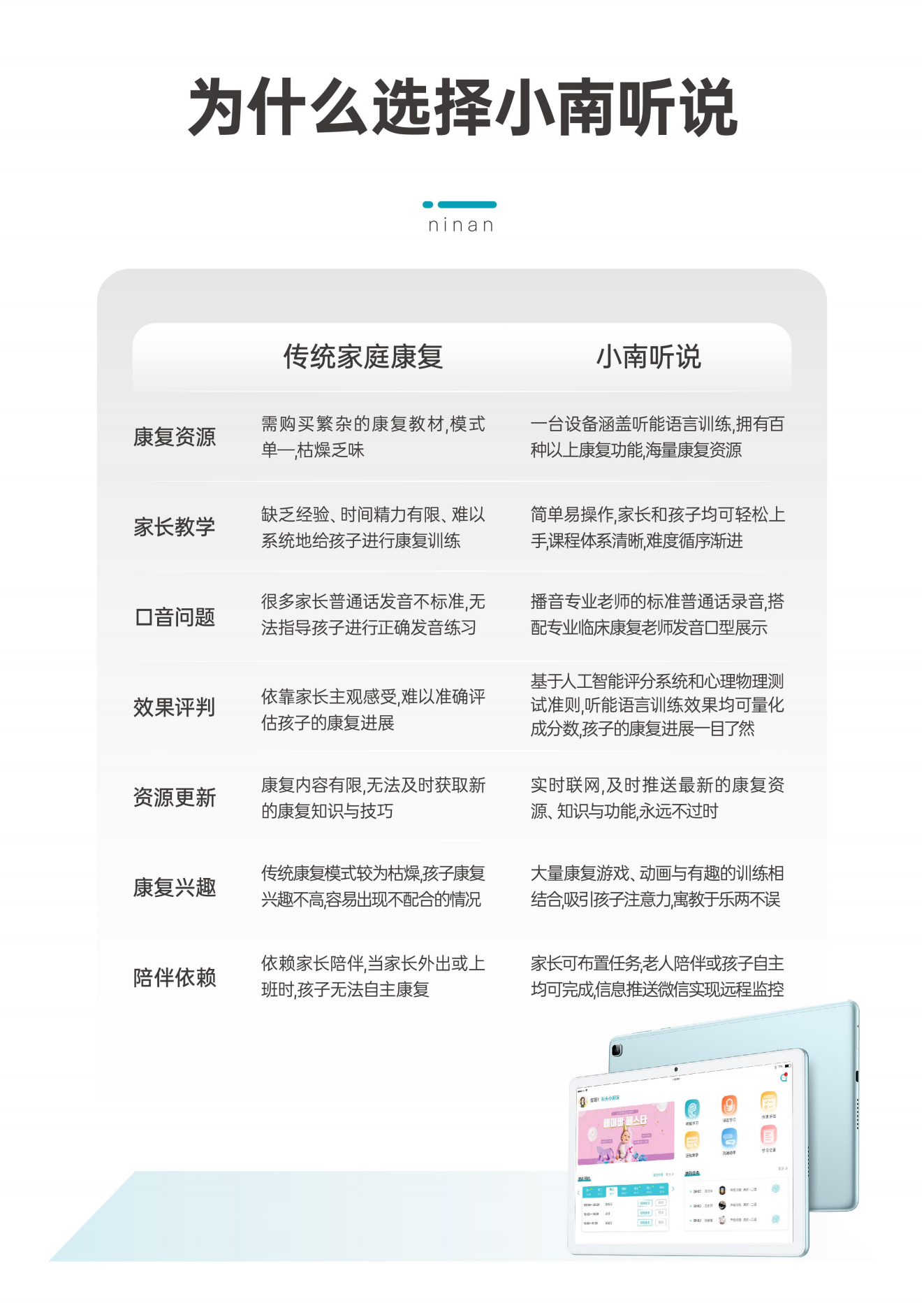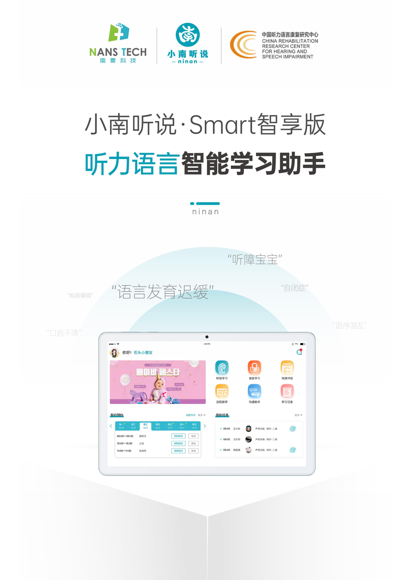 小南聽說聽力語言智能康復(fù)助手是一款基于人工智能和數(shù)字康復(fù)技術(shù)的語言康復(fù)產(chǎn)品,主要面向各類語言、認(rèn)知及聽力障礙的兒童,由一套智能訓(xùn)練系統(tǒng)和一套智能硬件設(shè)備組成,目前主要有專業(yè)版和智享版兩種硬件形態(tài),可實現(xiàn)智能化的家庭/機(jī)構(gòu)全方位康復(fù)訓(xùn)練。