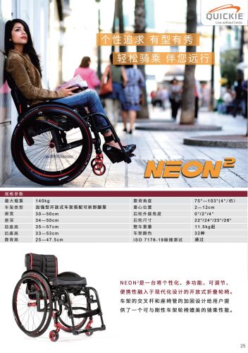 Neon2 是一臺將個性化、多功能可調節(jié)、便攜性融入于現代化設計的開放式折疊輪椅,車架的交叉桿和座椅管的加固設計給用戶提供了一個可與剛性車架輪椅媲美的騎乘性能。