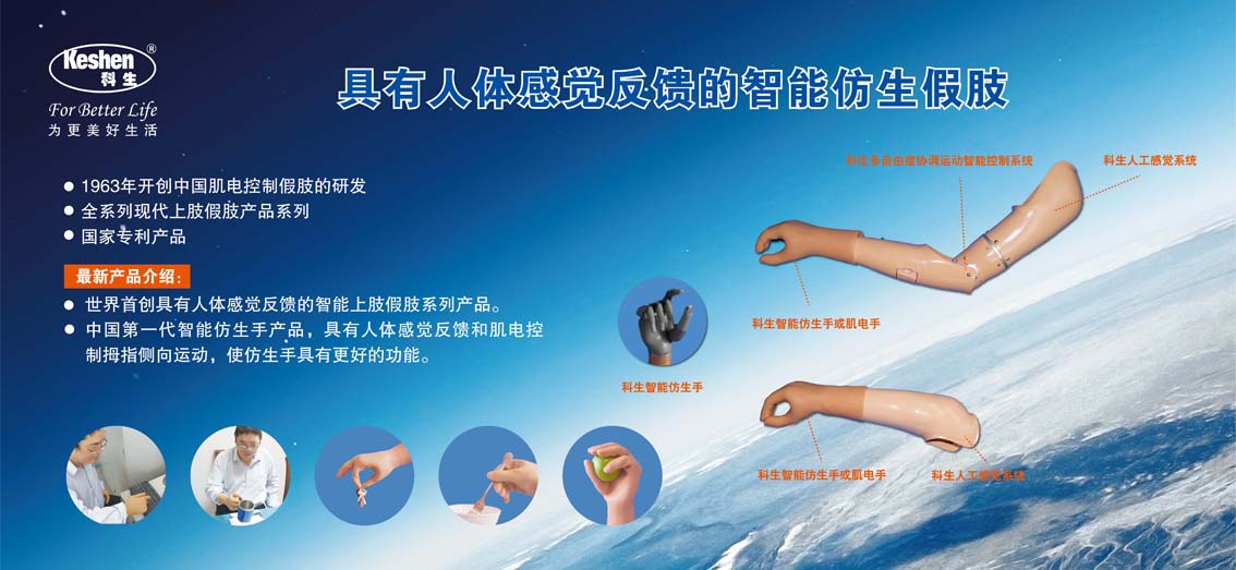 “世界首創(chuàng)有人體感覺反饋智能仿生手假肢產(chǎn)品。手部為智能仿生手或二維拇指肌電手。不依賴視覺,可感覺握物和握力大小。各關(guān)節(jié)包括手、腕、肘智能協(xié)同動作,使高位截肢者也能自如取食、吃飯、使用方便。可藍牙多功能設置。國家專利產(chǎn)品。”