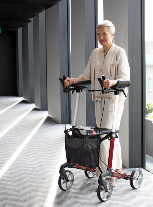 瑞云-航海家是為患有關(guān)節(jié)炎或手部功能受限的用戶開發(fā)的助行器,兼具功能性與舒適性。 前臂支撐架主要由大尺寸的海綿墊和手剎組成,用戶通過手臂的力量推動助行器前行,有固定式和旋轉(zhuǎn)式兩種類型可旋轉(zhuǎn)的支撐架有三個調(diào)節(jié)角度,滿足不同用戶的需求。