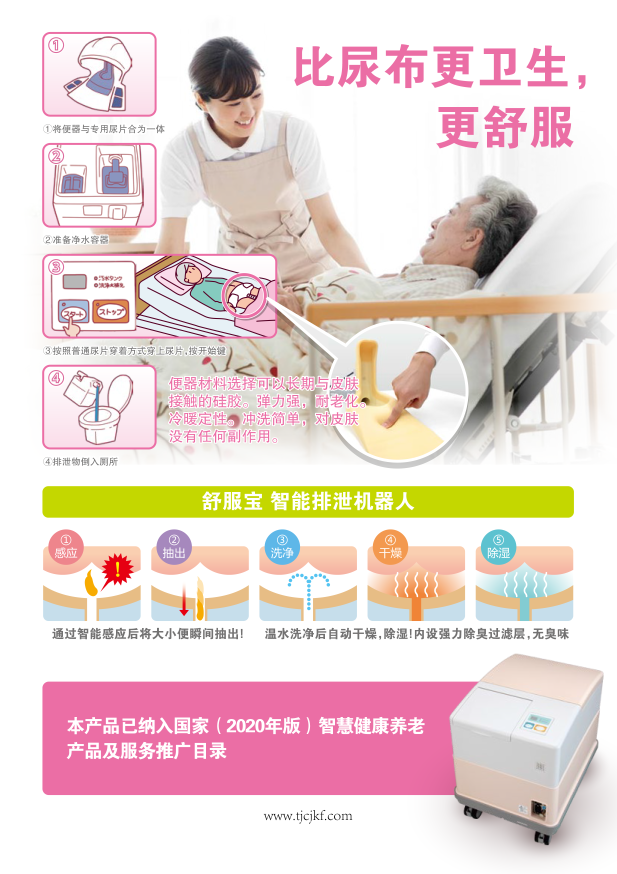 當患者意識上有大小便排泄時,鑲嵌在臀部墊下面的感應功能芯片,傳導到管理中心,電腦即時發(fā)出指令:瞬間開啟吸收功能鍵,將排泄物排泄到污物桶。 自動開啟溫水沖洗功能鍵,清洗大小便排泄處。 自動開啟干燥除濕功能鍵,將私處用微微的暖風吹干,患者長時間的使用不會出現紅疹及褥瘡等現象。