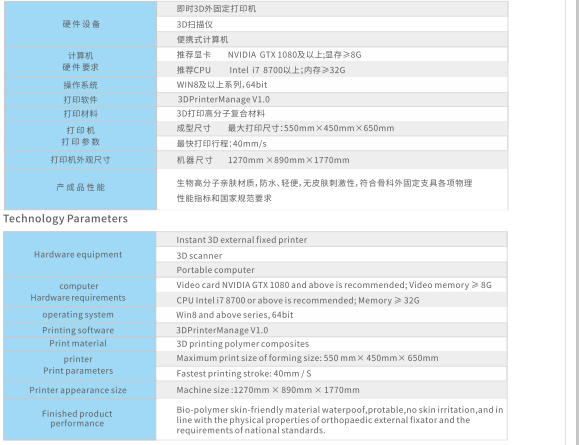 硬件設(shè)備:即時30外團定打印機、硬件設(shè)備、3D掃描佼、便攜式計算機。 成型尺寸:最大打印尺寸:550mmx450mmx650mm,最快打印行程:40mm/s 產(chǎn)成品性能:生物高分子親膚材質(zhì),防水、輕便,無皮膚刺激性,符合骨科外固定支具各項物理性能指標和國家規(guī)范要求