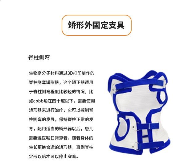 矯形外固定支具 脊柱側(cè)彎 生物高分子材料通過3D打印制作的脊柱側(cè)彎矯形器,這個(gè)矯正器適用于脊柱側(cè)彎程度比較輕的情況。比如cobb角在四十度以下,需要使用矯形器來進(jìn)行治療,它可以控制脊柱側(cè)彎的發(fā)展,保持脊柱正常的發(fā)育,配用適當(dāng)?shù)某C形器以后,患兒需要遵醫(yī)囑日常穿著,隨著身體的生長(zhǎng)更換合適的矯形器,直到脊柱定形以后才可以停止穿著。