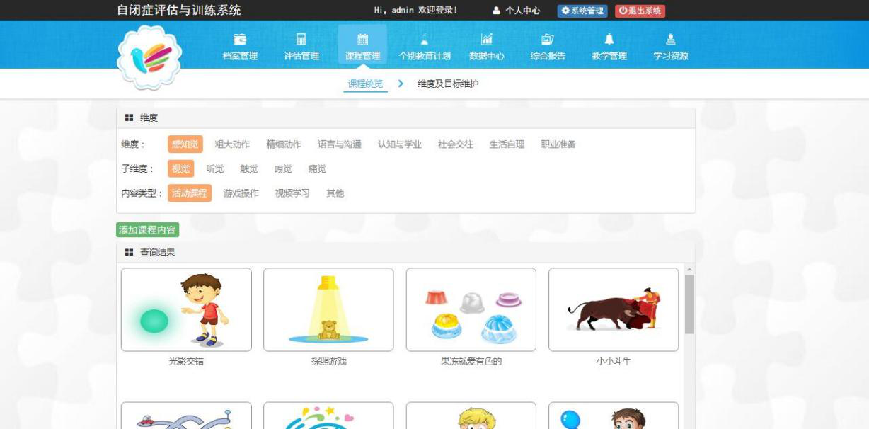 核心功能: 系統(tǒng)內置了如:TTAP、C-PEP-3等國內外權威的評估工具,涵蓋了從幼兒到成人的不同年齡階段的自閉癥人群的評估需求。并根據(jù)自閉癥人群的信息加工特點研發(fā)了感知覺、社會交往、語言溝通等八大維度的訓練內容,教師可以根據(jù)學生情況設置有針對性的課程,制定個別教育計劃,提高了教師的工作效率與工作質量,搭建起家校溝通的橋梁。