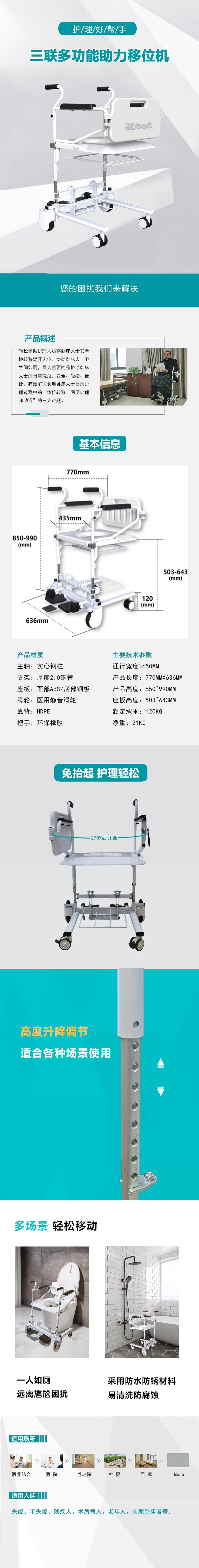三聯(lián)多功能助力移位機(jī),輕松的解決了照護(hù)老人、殘疾人過程中移位、如廁、助浴的三大難題。產(chǎn)品獨(dú)創(chuàng)270°后開合設(shè)計(jì),免抬起護(hù)理更輕松;高度可升降,適合多種場(chǎng)景;整體采用防水防銹材料,易清洗。