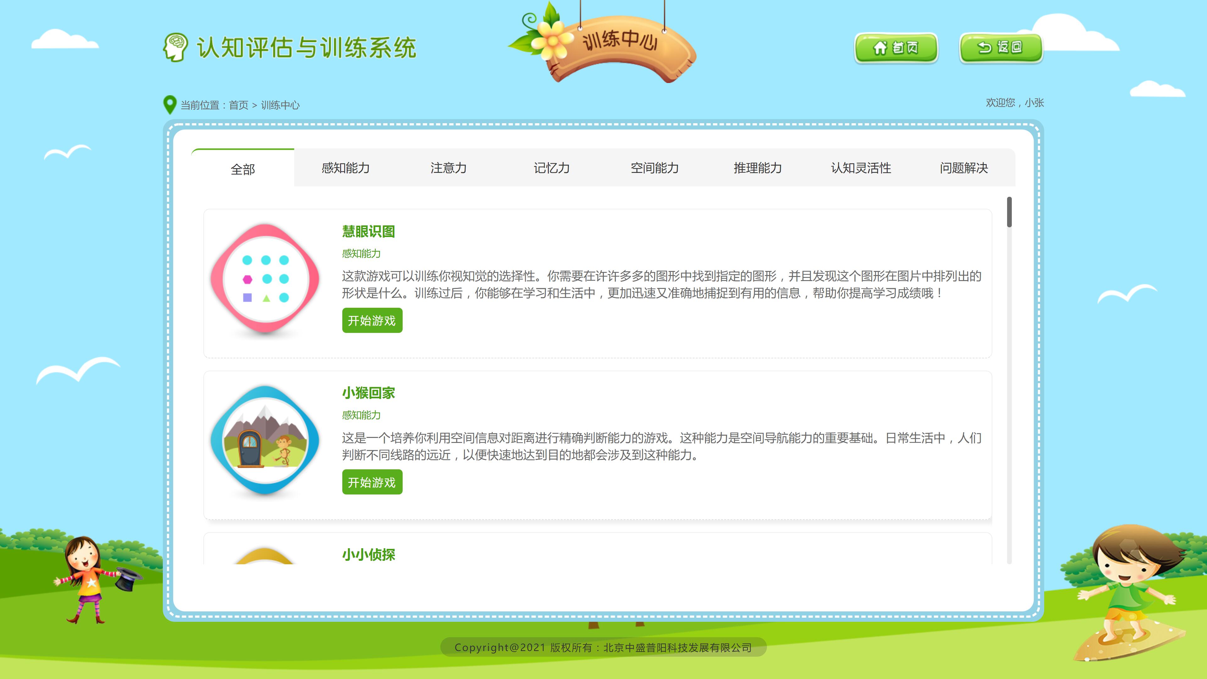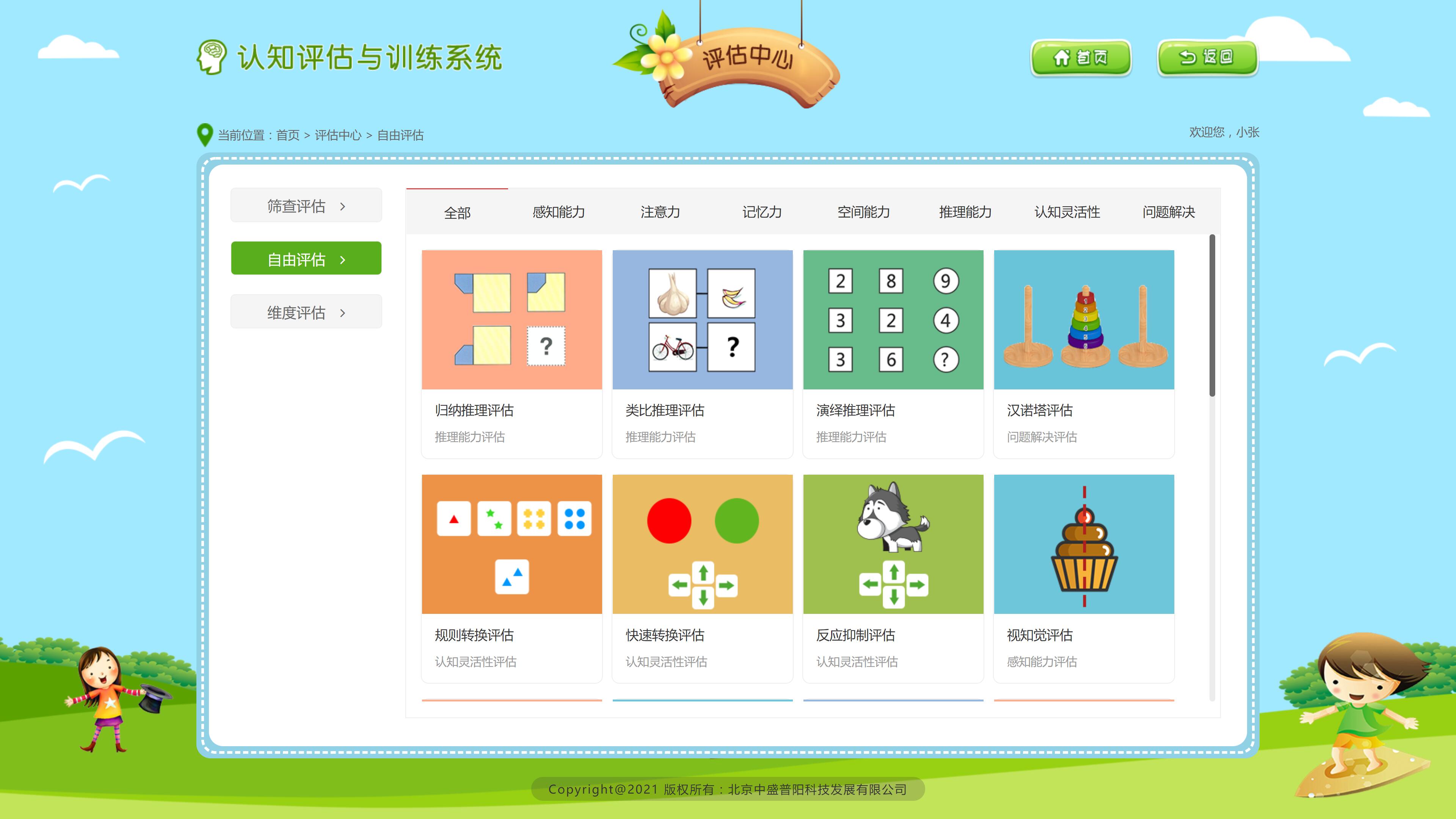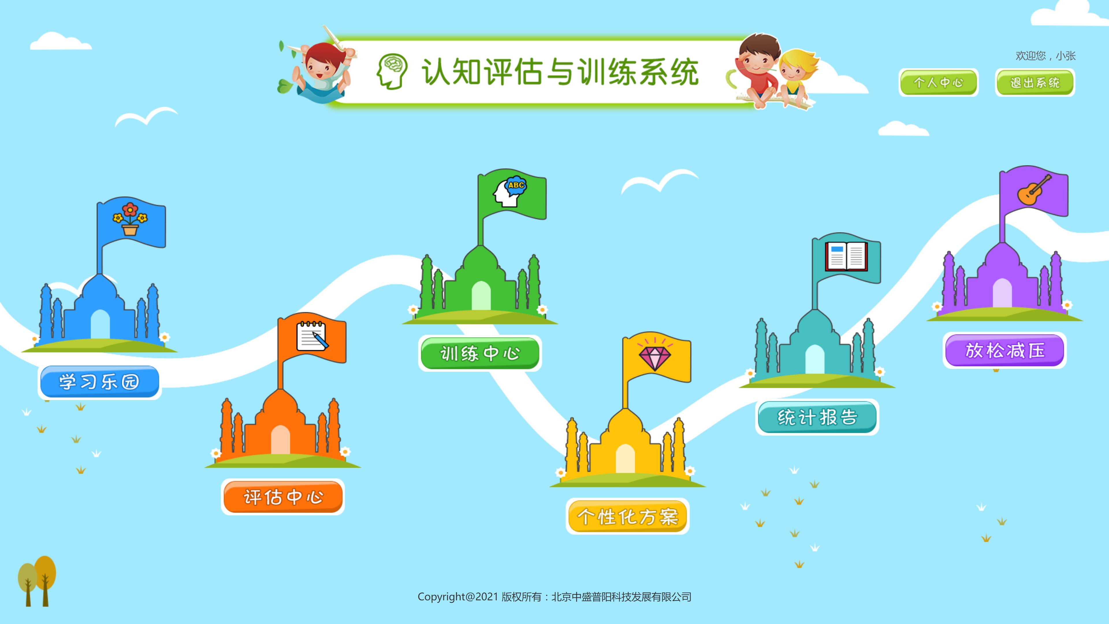 認知評估與訓練系統(tǒng)針對中小學生認知發(fā)展特點,對學生的感知覺、注意力、記憶力、空間能力、推理能力、認知靈活性和問題解決等認知能力進行綜合評估,同時提供針對各項認知能力的專業(yè)訓練游戲,來幫助學生發(fā)展他們各方面的認知能力。系統(tǒng)集檔案管理、評估管理、訓練管理、數(shù)據(jù)中心、學習樂園、個性化方案、系統(tǒng)管理、評估中心、訓練中心等功能于一體。