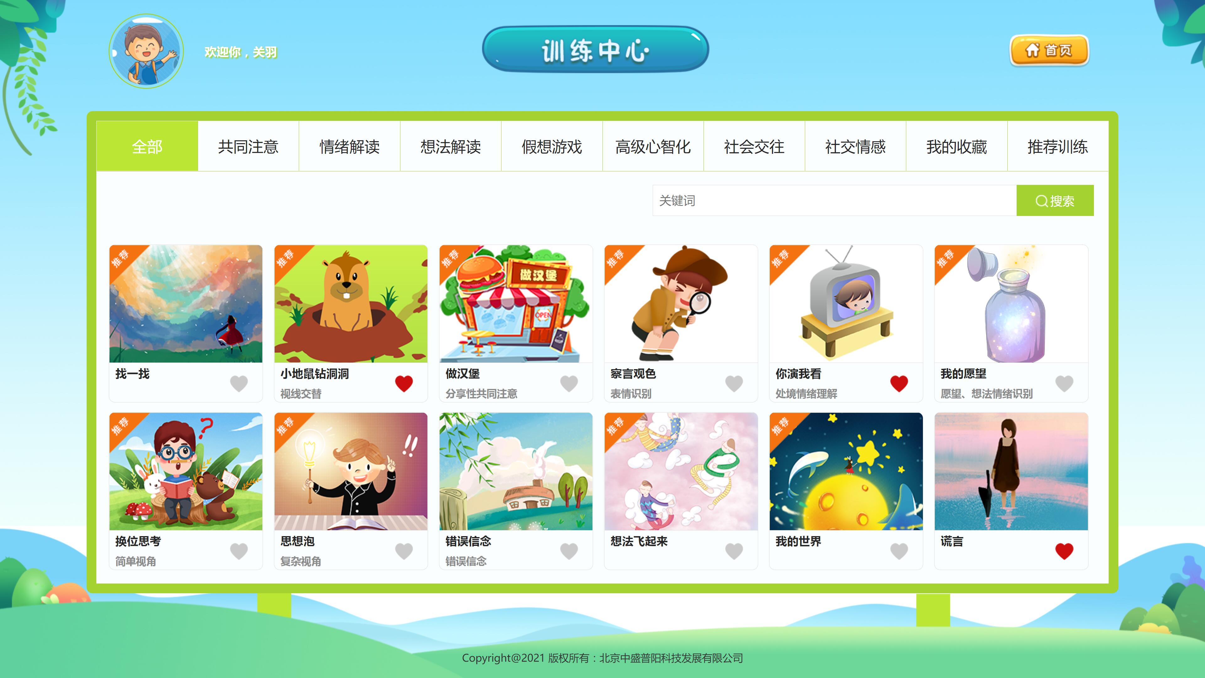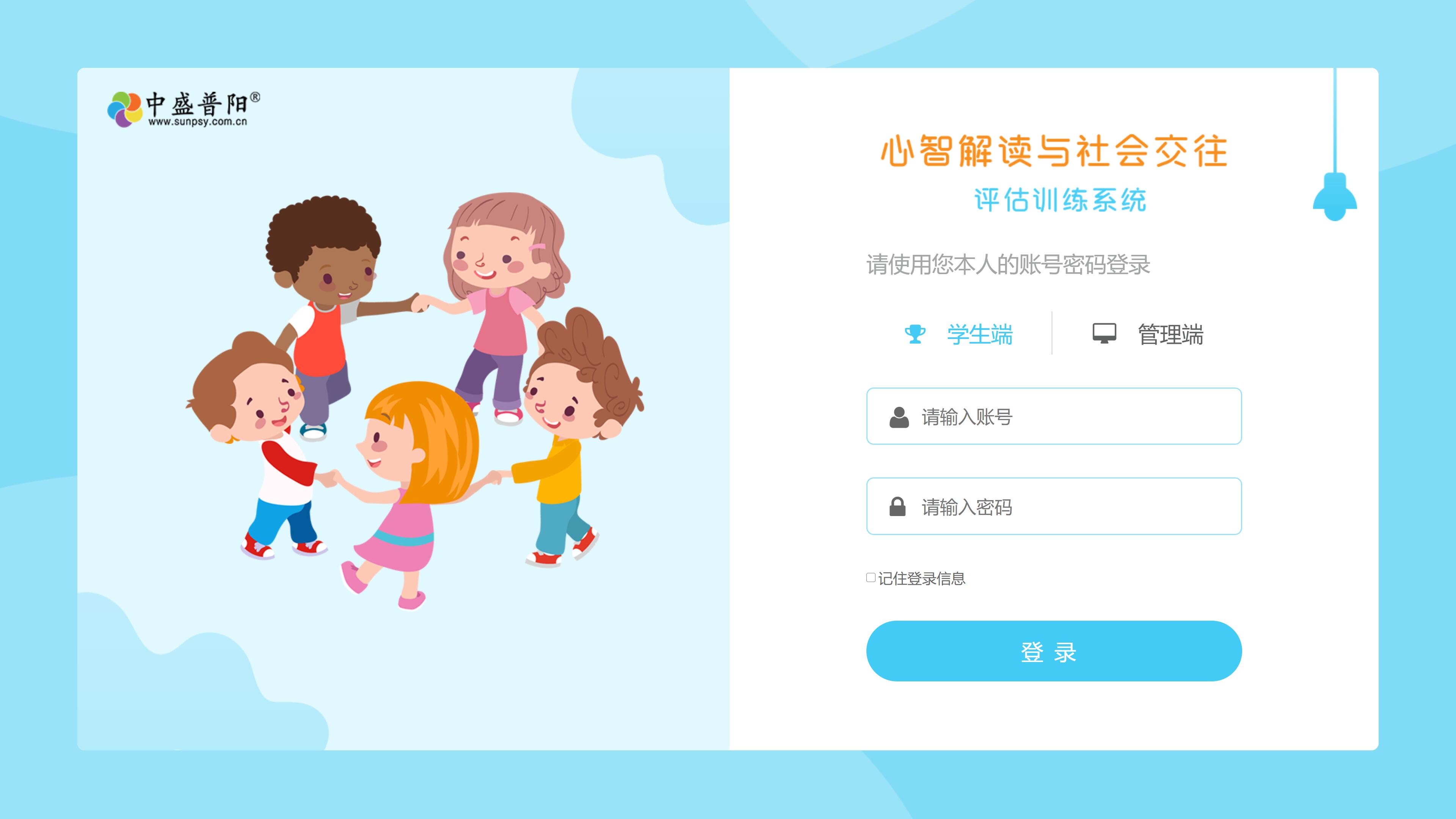 包含針對特殊兒童心智解讀與社會交往能力的評估與訓(xùn)練內(nèi)容,軟件適用于認(rèn)知能力達(dá)到兩歲以上水平的、心智化發(fā)展能力落后、社交及溝通能力較弱的兒童及自閉癥兒童。 系統(tǒng)集檔案管理、評估中心、訓(xùn)練中心、個性化方案管理、資源中心、系統(tǒng)管理、個人中心、個性化方案等功能于一體。 軟件的評估部分提供心智解讀能力觀察評估表、社交技能評定量表等專業(yè)評估工具。