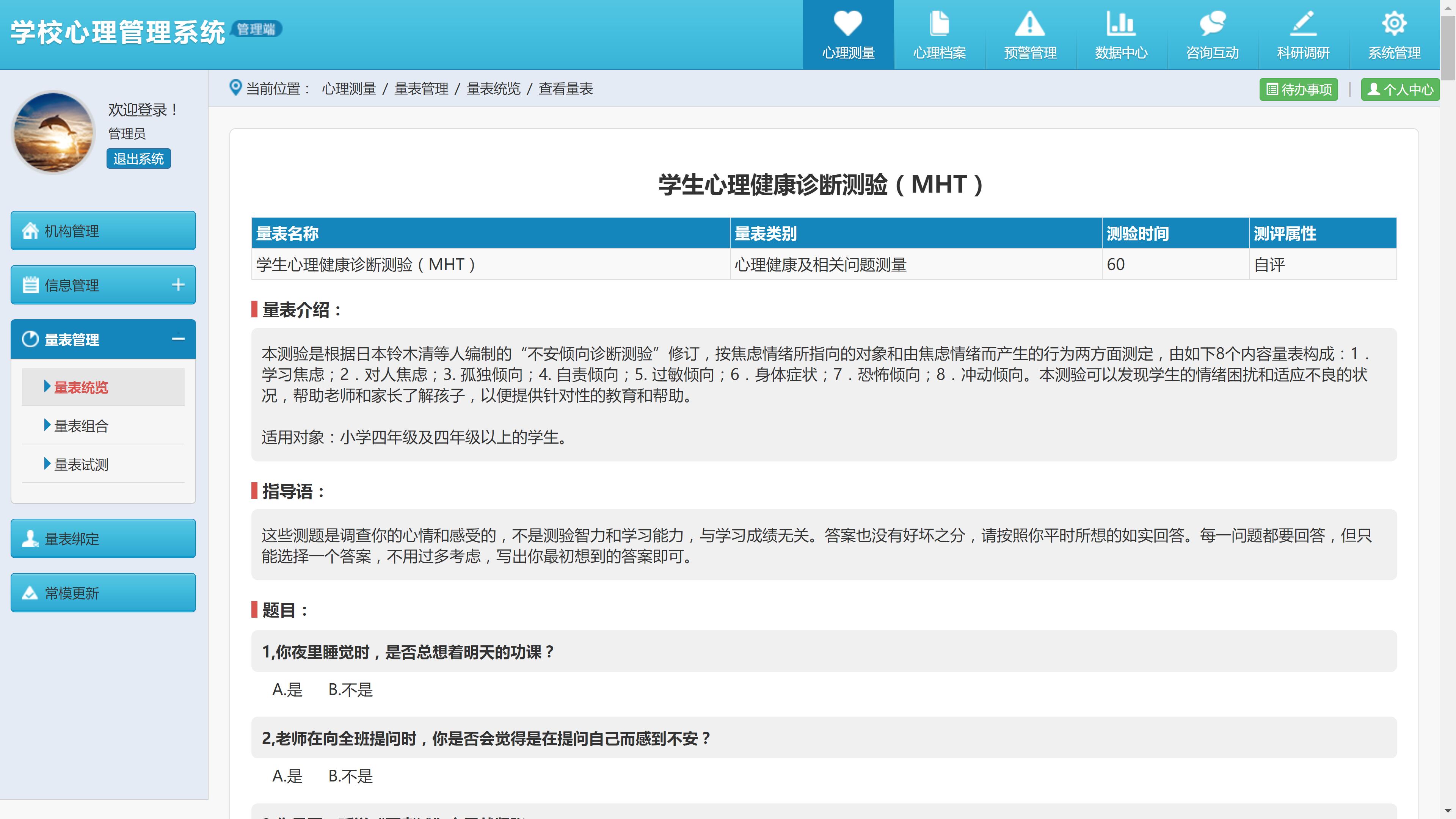 心理健康信息化綜合管理平臺(心理健康云平臺)是集學(xué)校綜合管理系統(tǒng)、心理咨詢師管理系統(tǒng)、學(xué)生測評系統(tǒng)、教師測評系統(tǒng)、家長測評系統(tǒng)等五大子系統(tǒng)于一體,將校長、心理教師、教師、學(xué)生、家長多角色進(jìn)行分類管理的學(xué)校心理教育工作綜合管理平臺,五大子系統(tǒng)通過綜合的心理健康網(wǎng)站平臺進(jìn)行集中統(tǒng)合管理。