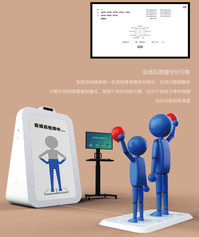 肢體協(xié)調(diào)互動(dòng)訓(xùn)練系統(tǒng)采用自適應(yīng)學(xué)習(xí)引擎、數(shù)據(jù)分析引擎等核心技術(shù),對(duì)兒童的上下肢以及體態(tài)進(jìn)行全面評(píng)估與針對(duì)性訓(xùn)練。 系統(tǒng)內(nèi)置評(píng)估功能,康復(fù)師可針對(duì)每一名兒童進(jìn)行系統(tǒng)評(píng)估,例如:上下肢肌力平衡性、協(xié)調(diào)性等進(jìn)行科學(xué)的評(píng)估。大數(shù)據(jù)引擎可對(duì)評(píng)估結(jié)果進(jìn)行對(duì)比與分析,自動(dòng)生成評(píng)估報(bào)告,各項(xiàng)功能指標(biāo)數(shù)據(jù)化、圖形化,一目了然,方便康復(fù)師查詢、導(dǎo)出與存檔。