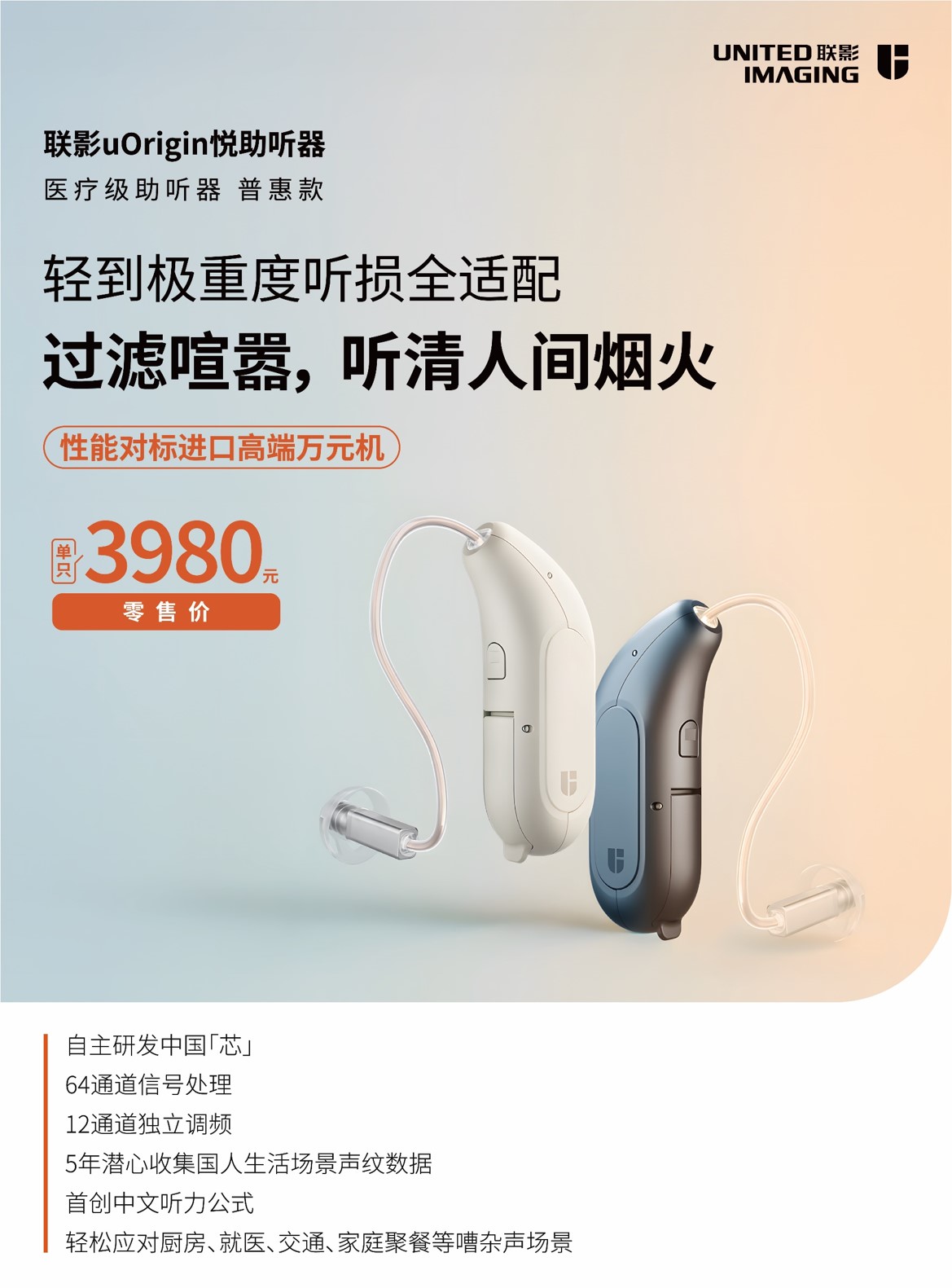 聯(lián)影“悅”助聽器,12通道可調(diào),專為所有聽力需求設(shè)計(jì),搭載極限降噪科技,即使身處喧鬧街道或擁擠地鐵,也能讓您輕松駕馭環(huán)境,對(duì)話清晰自在。強(qiáng)勁續(xù)航與快速充電技術(shù),保障您全天候持久暢聽,不斷電。更以卓越音質(zhì),帶來(lái)清晰、舒適、自然的聽覺體驗(yàn),為您開啟全天無(wú)憂的聆聽新境界。