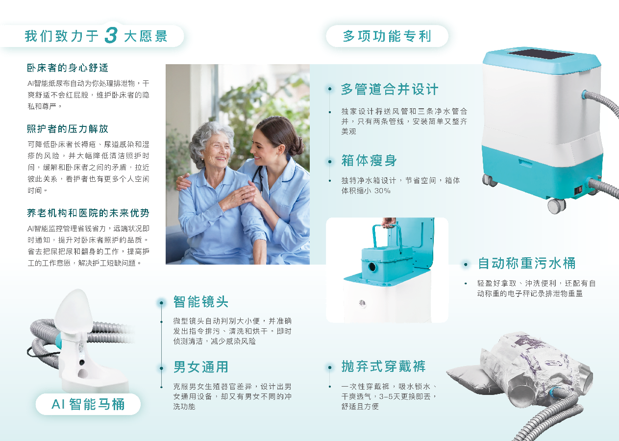 笑籽排泄機器人也稱為AI智能紙尿布,是專為臥床失能病人設(shè)計的產(chǎn)品,在床上用的智能馬桶,由AI智能識別大小便,自動啟動不同的模式為使用者清潔大小便,并且沖洗烘干,還會拍照記錄排泄物的樣態(tài)、時間和重量,協(xié)助了解使用者的情況。特制專用的一次性尿布,用兩三天丟棄,干凈輕松方便。AI可以啟動排尿、頻尿和排便不同模式?jīng)_洗烘干,達到省水省電的效益。