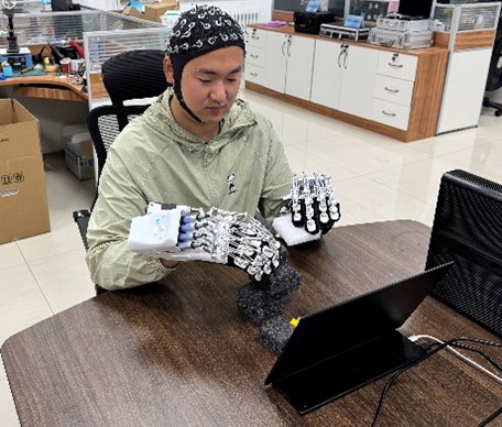 基于自主研發(fā)的輕量化可穿戴康復(fù)機(jī)械,開發(fā)了基于腦機(jī)接口的腦控協(xié)同康復(fù)機(jī)械手系統(tǒng),并作為2025年世界機(jī)器人大賽-BCI腦控機(jī)器人大賽賽事平臺之一。該系統(tǒng)通過非侵入式SSVEP技術(shù),控制康復(fù)機(jī)械手完成抓握、捏取、雙手協(xié)作等動作訓(xùn)練,促進(jìn)神經(jīng)功能重塑與運動功能重建。