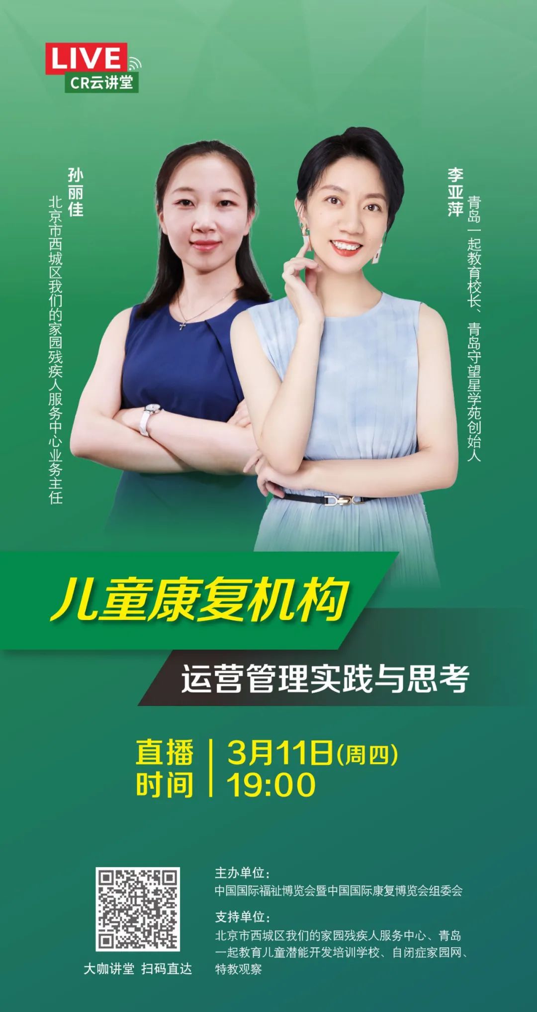 3月11日(周四),CR EXPO直播課邀請(qǐng)到青島一起教育校長(zhǎng)李亞萍、北京市西城區(qū)我們的家園殘疾人服務(wù)中心業(yè)務(wù)主任孫麗佳,與大家分享“兒童康復(fù)機(jī)構(gòu)運(yùn)營(yíng)管理實(shí)踐與思考”。