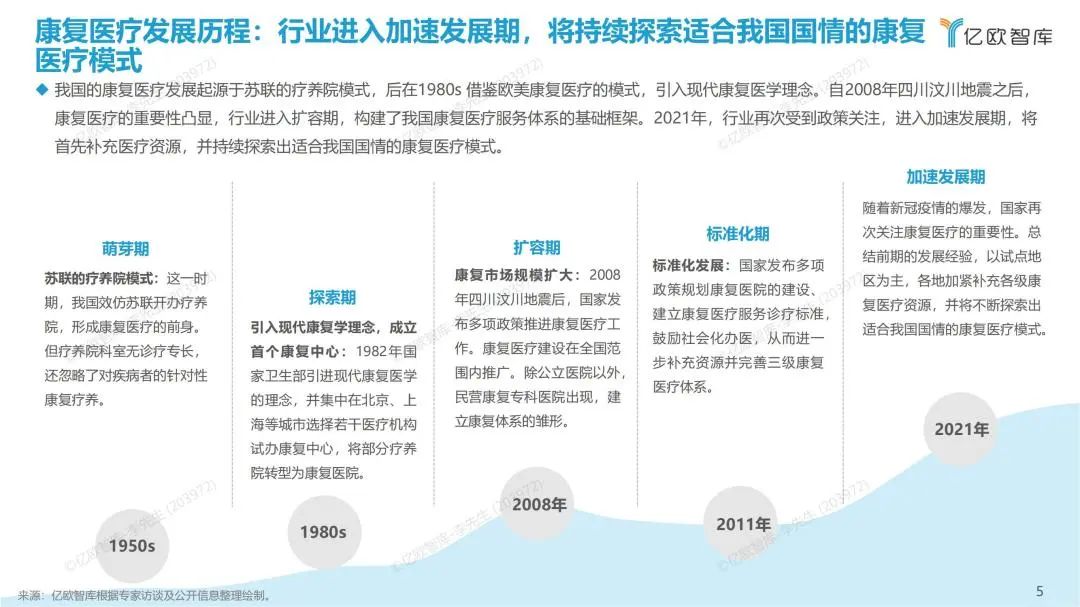 我國的康復(fù)醫(yī)療發(fā)展起源于蘇聯(lián)的療養(yǎng)院模式,后在1980s借鑒歐美康復(fù)醫(yī)療的模式,引入現(xiàn)代康復(fù)醫(yī)學理念。自2008年四川汶川地震之后,康復(fù)醫(yī)療的重要性凸顯,行業(yè)進入擴容期,構(gòu)建了我國康復(fù)醫(yī)療服務(wù)體系的基礎(chǔ)框架。2021年,康復(fù)行業(yè)再次受到政策關(guān)注,進入加速發(fā)展期。