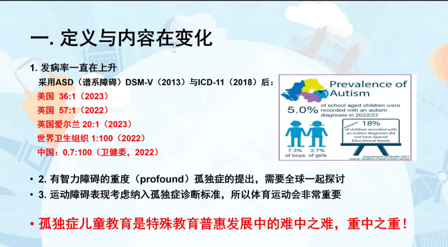 論壇最后,徐云教授作《孤獨(dú)癥兒童教育教學(xué)的國(guó)際新動(dòng)態(tài)及對(duì)我國(guó)的啟示》專題講座。他指出,孤獨(dú)癥譜系障礙的發(fā)病率一直在上升,孤獨(dú)癥兒童教育是特殊教育普惠發(fā)展中的難中之難,重中之重!世界各國(guó)均重視孤獨(dú)癥教育,紛紛出臺(tái)相應(yīng)教育指南。立足中國(guó)特色,要注意本土文化語(yǔ)言體系的表述,遵循兒童身心特征,堅(jiān)持“育人為本”,將心理學(xué)的“知、情、意、行、群”與我國(guó)的“德智體美勞”五育并舉課程體系有機(jī)對(duì)接。徐云教授針對(duì)孤獨(dú)癥兒童的“教學(xué)內(nèi)容”“教學(xué)方法”以及“面臨的挑戰(zhàn)”給予針對(duì)性講解。他強(qiáng)調(diào),孤獨(dú)癥兒童不是學(xué)不會(huì),而是沒(méi)有機(jī)會(huì);不是無(wú)潛能,而是沒(méi)有被發(fā)現(xiàn)。給予適宜、個(gè)性的支持,孤獨(dú)癥兒童完全有可能對(duì)社會(huì)發(fā)展作出巨大貢獻(xiàn)!