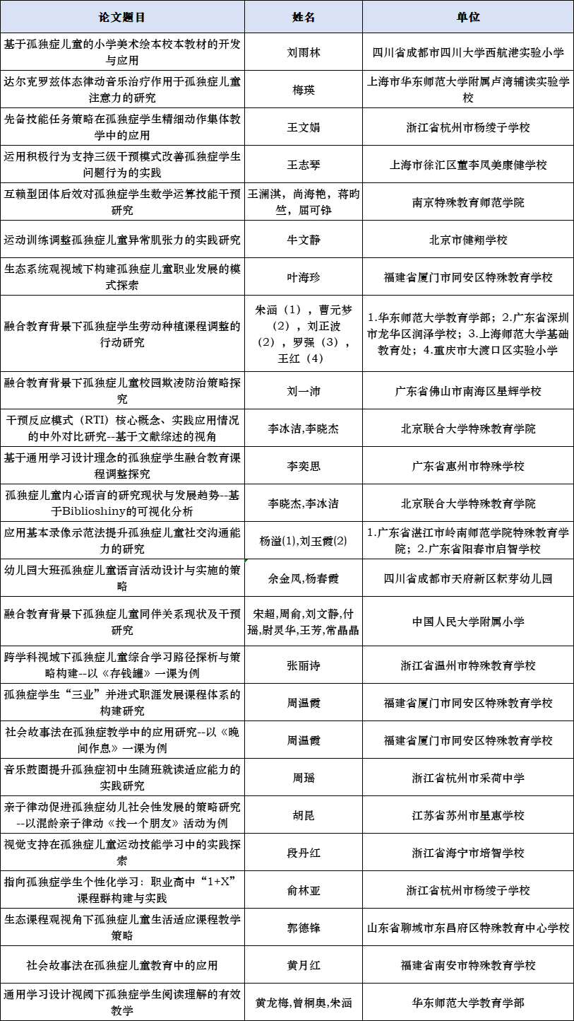 公布第一屆孤獨癥教育教學征集優(yōu)秀組織單位,優(yōu)秀、創(chuàng)新和鼓勵論文名單;公布第一屆孤獨癥教學案例優(yōu)秀組織單位,優(yōu)秀、創(chuàng)新和鼓勵課例名單
