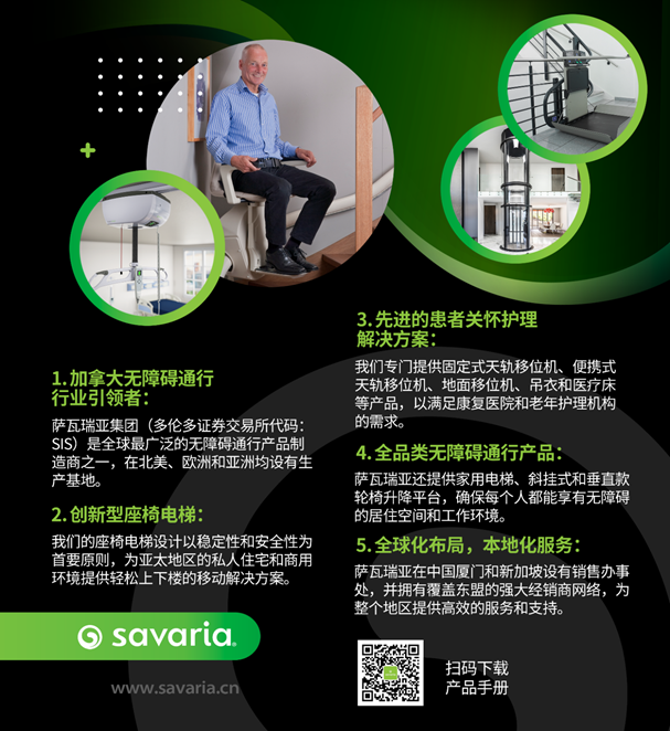 薩瓦瑞亞集團(Savaria)是全球無障礙通行解決方案的行業(yè)引領(lǐng)者,致力于提升個人在室內(nèi)外自由出行的獨立性。我們設(shè)計、制造并安裝所有的無障礙通行產(chǎn)品,如座椅電梯、輪椅電梯、天軌移位機以及家用電梯,幫助人們在居住、工作和娛樂的空間上獲得更多靈活性。我們在全球范圍內(nèi)擁有超過2300名員工,在北美、歐洲和中國設(shè)有17個生產(chǎn)基地,并在全球范圍內(nèi)擁有30多個辦事處,以便更高效地服務(wù)全球市場,快速響應(yīng)客戶地定制化需求。