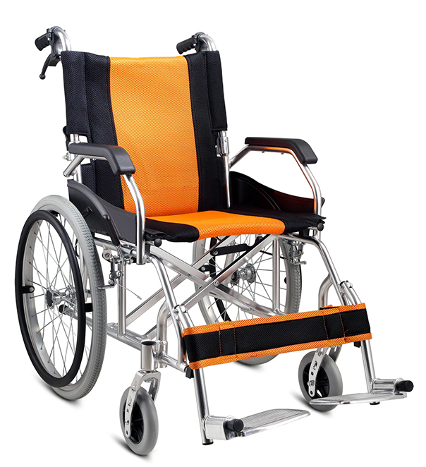 可折疊鋁合金輪椅,座靠背墊顏色可選,后折靠背,上翻腳托。