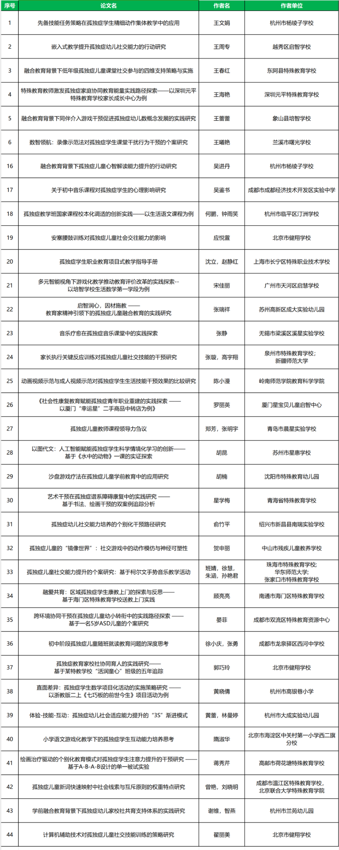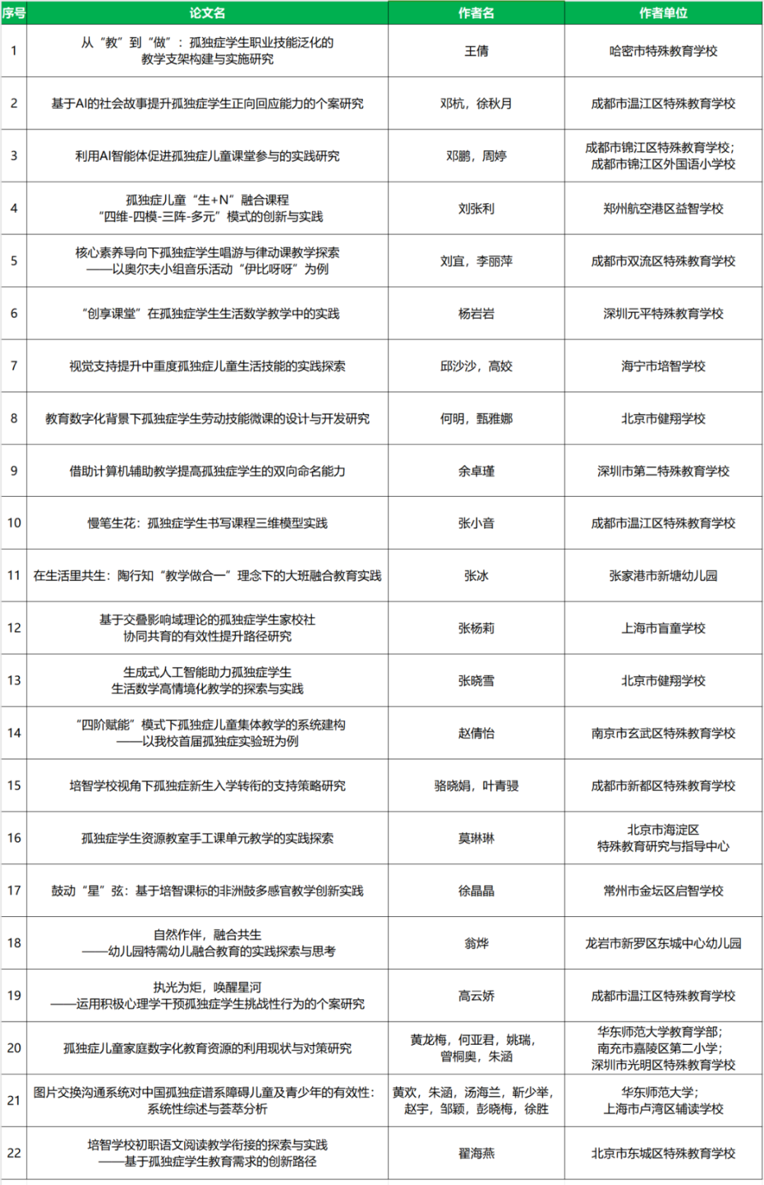 南京特殊教育師范學(xué)院特殊教育學(xué)院聯(lián)合2025中國國際福祉博覽會暨中國國際康復(fù)博覽會(CR EXPO)、中國教育學(xué)會特殊教育分會智障教育專委會、殘疾人事業(yè)發(fā)展研究會融合教育專委會、江蘇教育報刊總社現(xiàn)代特殊教育編輯部、北京教育科學(xué)研究院北京市特殊教育研究指導(dǎo)中心、北京市海淀區(qū)特殊教育研究與指導(dǎo)中心、杭州市上城區(qū)特殊教育指導(dǎo)中心等聯(lián)合舉辦的“第二屆孤獨癥教育教學(xué)論文征集”活動,征集到全國30個省市自治區(qū)738篇論文。經(jīng)相關(guān)專家評審研究決定,共有22篇論文榮獲優(yōu)秀論文,44家篇論文榮獲創(chuàng)新論文,68篇論文為鼓勵論文。公布如下: