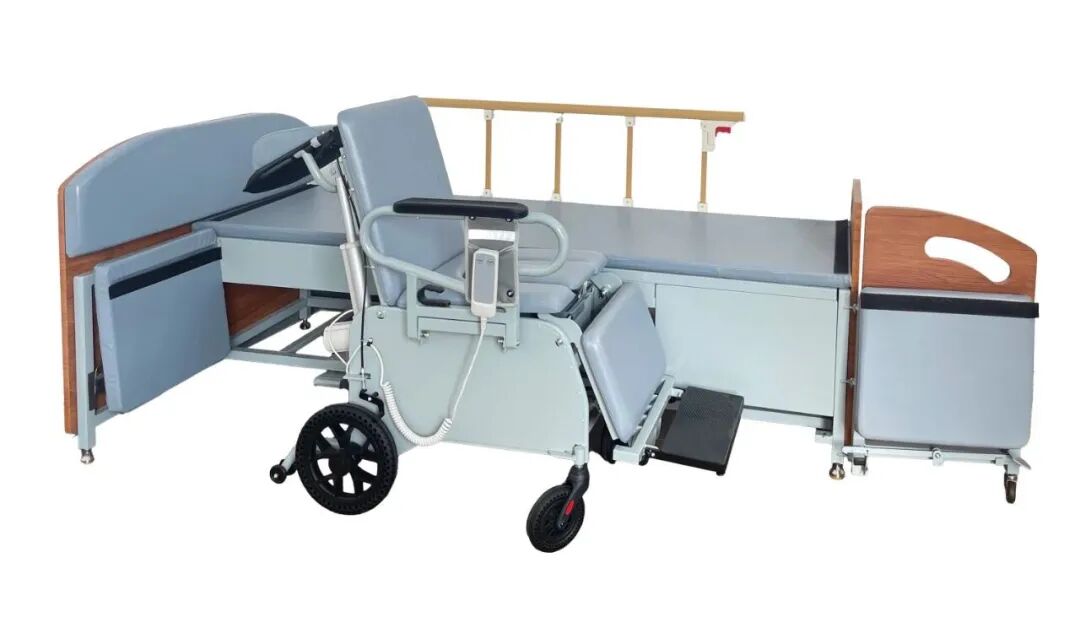 床體部分小尾板可進(jìn)行90°開(kāi)啟,方便護(hù)理人員輕松分離和組合輪椅與床體。