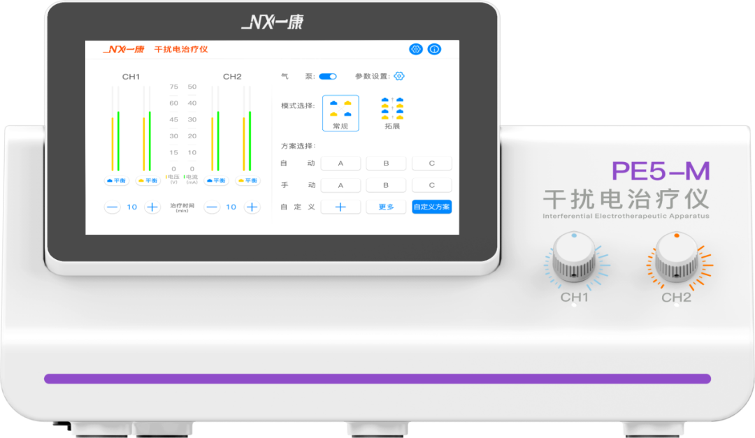 便攜式干擾電治療儀PE5-M是在傳統(tǒng)干擾電療法和動態(tài)干擾電療法的基礎(chǔ)上進(jìn)一步發(fā)展起來,在體內(nèi)形成的低頻干擾內(nèi)生電流,可以抑制感覺神經(jīng),同時促使毛細(xì)血管與動脈擴(kuò)張,局部血液循環(huán)的改變有利于炎癥滲出液,水腫的吸收等作用。干擾產(chǎn)生的低頻差,利用中頻電流比低頻電流更高的穿透性,透入人體組織的深層。