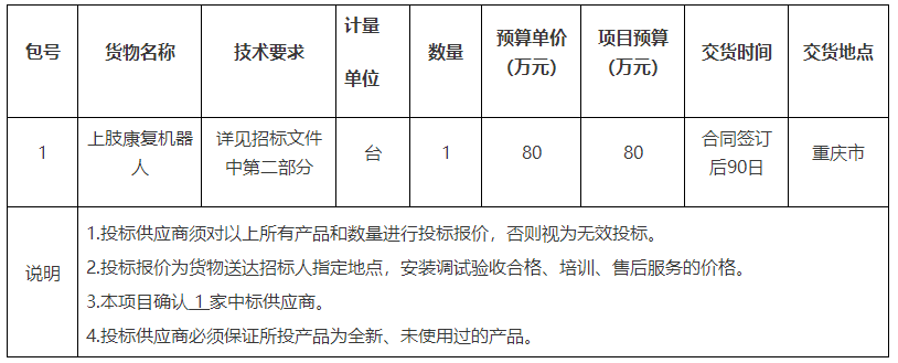 項目名稱:重慶市某單位上肢康復(fù)機器人招標(biāo)公告(2022-JL13(03)-W10330)