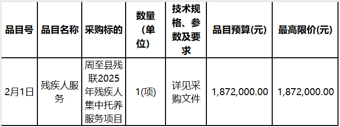 西安市周至縣殘疾人聯(lián)合會(本級)周至縣殘聯(lián)2025年殘疾人集中托養(yǎng)服務(wù)項目(二次)招標(biāo)公告