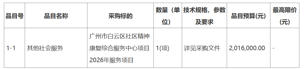 廣州市白云區(qū)社區(qū)精神康復(fù)綜合服務(wù)中心項目2026年服務(wù)項目公開招標(biāo)公告