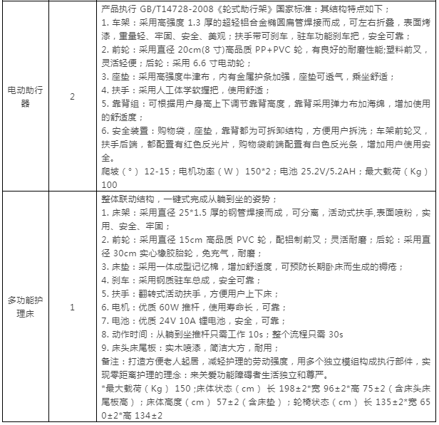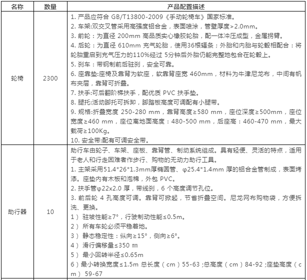 采購產(chǎn)品及數(shù)量:輪椅2300輛;助行器10個;電動助行器2個;多功能護理床1張。