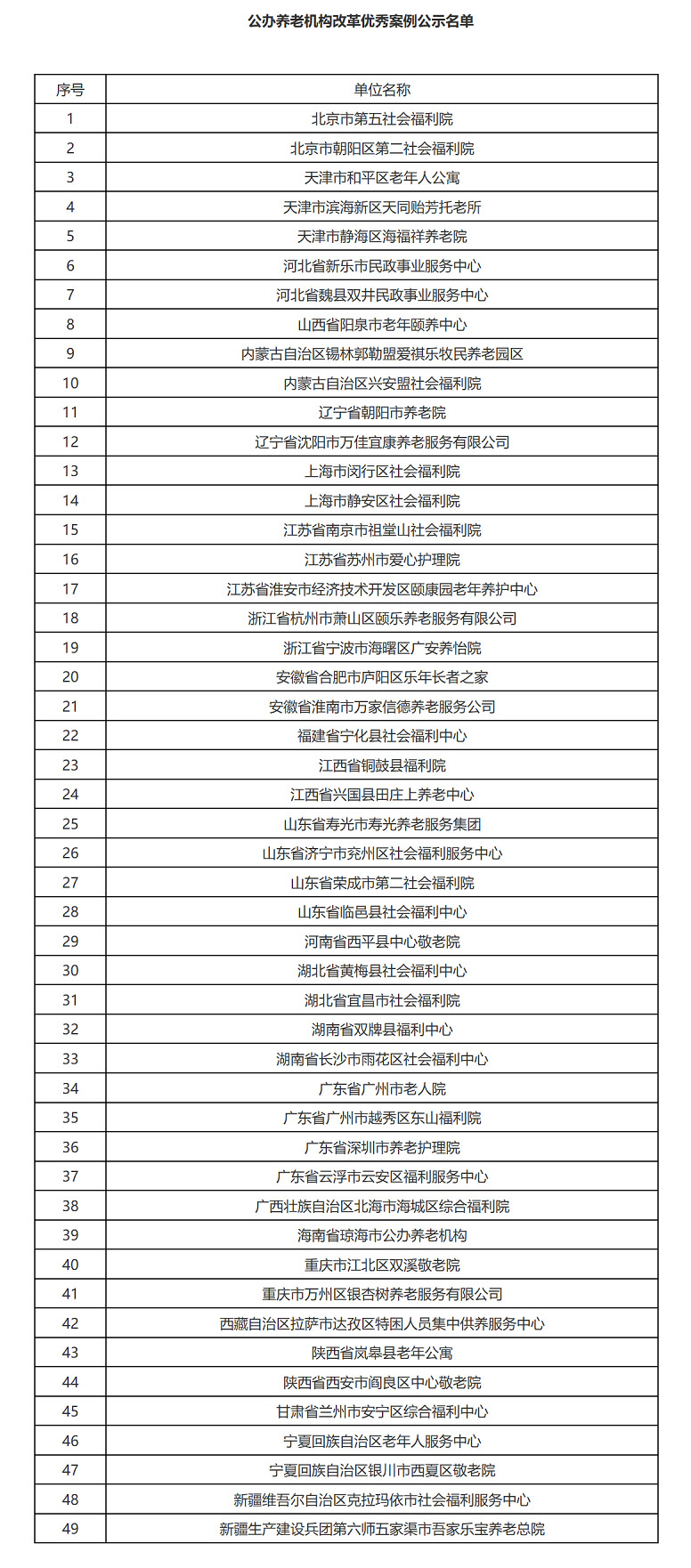 根據(jù)《民政部辦公廳國(guó)家發(fā)展改革委辦公廳關(guān)于開(kāi)展公辦養(yǎng)老機(jī)構(gòu)改革試點(diǎn)工作總結(jié)推廣公辦養(yǎng)老機(jī)構(gòu)改革典型經(jīng)驗(yàn)的通知》(民辦函〔2020〕57號(hào))要求,民政部養(yǎng)老服務(wù)司、國(guó)家發(fā)展改革委社會(huì)發(fā)展司開(kāi)展了公辦養(yǎng)老機(jī)構(gòu)改革典型經(jīng)驗(yàn)收集及遴選工作,按照地方推薦、專(zhuān)家評(píng)審、部門(mén)聯(lián)審等程序,遴選出了北京市第五社會(huì)福利院等49家公辦養(yǎng)老機(jī)構(gòu)改革優(yōu)秀案例,現(xiàn)予公示。