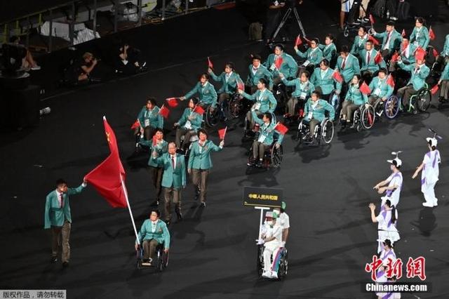 與東京奧運(yùn)會(huì)開幕式一樣,2020東京殘奧會(huì)開幕式也采取無觀眾形式。中國代表團(tuán)在“雙旗手”女子輪椅射箭運(yùn)動(dòng)員周佳敏、男子肢殘?zhí)飶竭\(yùn)動(dòng)員王浩的帶領(lǐng)下入場(chǎng)。