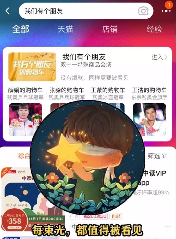 這個“隱藏會場”還能看到薛娟、張淼、王蒙和王浩這4位殘奧會冠軍分享的雙11購物車。
