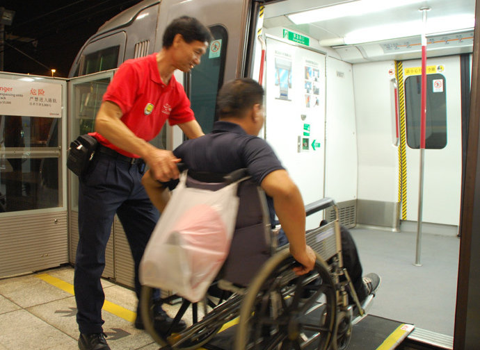 地鐵的工作人員幫助殘疾人上、下車(chē)