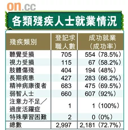 根據(jù)香港政府統(tǒng)計(jì)處12月17日公布的“殘疾人士及長(zhǎng)期病患者統(tǒng)計(jì)調(diào)查”,現(xiàn)約有96900 人(19.7%)加入了就業(yè)市場(chǎng)。就業(yè)的殘疾人士,每月就業(yè)收入中位數(shù)為$14,000。