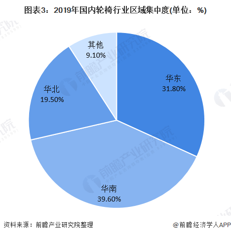 我國輪椅主要的生產基地集中在上海、廣東、江浙和天津等地區(qū),華南、華東地區(qū)占據主要市場。截止2019年,我國國內輪椅行業(yè)區(qū)域集中度分別為華東31.8%,華南39.6%,華北19.5%,其他9.1%。