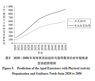 本研究基于體育強(qiáng)國建設(shè)與人口老齡化的現(xiàn)實背景,利用人口預(yù)測和增長曲線擬合的方法對我國“十四五”期間和中長期的老年體育鍛煉人口的規(guī)模和結(jié)構(gòu)變動趨勢進(jìn)行了預(yù)測。第一,我國參加體育鍛煉的老年人口總體規(guī)模將持續(xù)增長,“十四五”末期將達(dá)到8 471萬人,到2035年達(dá)到1.9億人,2050年達(dá)到2.6億人。第二,未來經(jīng)常參加體育鍛煉的老年人口年齡結(jié)構(gòu)將進(jìn)一步老化,高齡老年人占老年體育鍛煉者的比重有所上升。第三,參與各類體育活動項目的老年鍛煉者將快速增長,預(yù)計到2050年左右將有超過2億人規(guī)模的老年人經(jīng)常進(jìn)行步行鍛煉。第四,各類場地需要承載的老年鍛煉者規(guī)模持續(xù)擴(kuò)大,公園、廣場類需要承載的老年體育鍛煉者將在2050年達(dá)到1.8億人的規(guī)模。第五,老年人鍛煉時對正式組織和專業(yè)指導(dǎo)人員的需求將持續(xù)增加,到2050年約有600萬老年人需要通過正式組織的方式進(jìn)行鍛煉,約927萬老年人需要專業(yè)體育指導(dǎo)人員進(jìn)行指導(dǎo)。