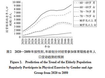 摘要:運(yùn)用人口預(yù)測和增長曲線擬合方法,利用2018年國家統(tǒng)計局1‰人口抽樣調(diào)查數(shù)據(jù)和2018年《中國老年社會追蹤調(diào)查》數(shù)據(jù),對我國經(jīng)常參加體育鍛煉的老年人口規(guī)模和結(jié)構(gòu)等狀況進(jìn)行發(fā)展趨勢預(yù)測分析。結(jié)果顯示,我國經(jīng)常參加體育鍛煉的老年人口總規(guī)模將持續(xù)增長,預(yù)測到“十四五”末期將增長至8 471萬人,到2035年達(dá)到1.9億人,2050年達(dá)到2.6億人。未來一段時期內(nèi),經(jīng)常參加體育鍛煉的老年人口年齡結(jié)構(gòu)將進(jìn)一步老化,參與各類體育活動的人口數(shù)量將快速增長,對鍛煉場地、專業(yè)組織和指導(dǎo)人員的需求顯著增加。