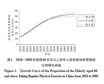 其中,t為時間,P為時間t時60歲及以上老年人經(jīng)常參加體育鍛煉的人數(shù)比例,e為自然對數(shù)的底數(shù),L為老年人總體鍛煉比例的最大極限值,a、b為相關(guān)參數(shù)。本研究根據(jù)(2)式預(yù)測老年人總體鍛煉比例的增長曲線,將2018年CLASS結(jié)果(13.27%)作為預(yù)測曲線的第一個基準(zhǔn)點(diǎn)。參照《體育強(qiáng)國建設(shè)綱要》提出的2035年經(jīng)常參加體育鍛煉人數(shù)比例達(dá)到45%以上的戰(zhàn)略目標(biāo),將其作為預(yù)測曲線的第二個基準(zhǔn)點(diǎn)。參照已步入深度老齡化社會的日本老年人鍛煉水平對老年人總體鍛煉比例的極限值(L)進(jìn)行設(shè)定。根據(jù)日本厚生勞動省發(fā)布的“國民健康營養(yǎng)調(diào)查”②中老年人“有運(yùn)動習(xí)慣者”③的比例,本研究設(shè)定了老年人總體鍛煉人數(shù)比例極限值為50%、55%、60%的低、中、高3個方案。據(jù)此,通過Logistic增長曲線擬合出3種方案下2018—2050年老年人中經(jīng)常參加體育鍛煉的比例(圖1)。