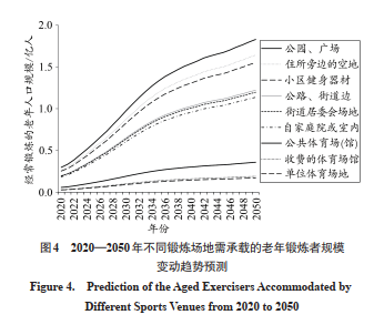 2018年CLASS數(shù)據(jù)顯示,參加體育鍛煉的老年人使用最多的場地是公園、廣場。約69.18%的老年人在公園、廣場進(jìn)行鍛煉;超過40%的老年鍛煉者在住所旁邊的空地、小區(qū)健身器材、公路、街道邊、街道居委會場地、自家庭院或室內(nèi)鍛煉;13.59%的老年鍛煉者使用過公共體育場(館);使用收費(fèi)的體育場館和單位體育場地鍛煉的老年鍛煉者僅占7.24%和6.52%。假定參加體育鍛煉的老年人對于不同活動場地的需求模式不變,可以預(yù)測到2050年各類場地需承載的老年鍛煉人口規(guī)模變動趨勢(圖4)。