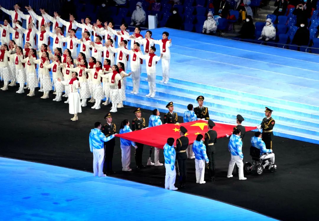 鳥巢中央,一面五星紅旗在殘疾人運(yùn)動(dòng)員和為殘疾人事業(yè)做出突出貢獻(xiàn)的8位護(hù)旗手的護(hù)送下,莊嚴(yán)入場(chǎng)。中華人民共和國(guó)國(guó)歌奏響,五星紅旗冉冉升起,迎風(fēng)飄揚(yáng)。