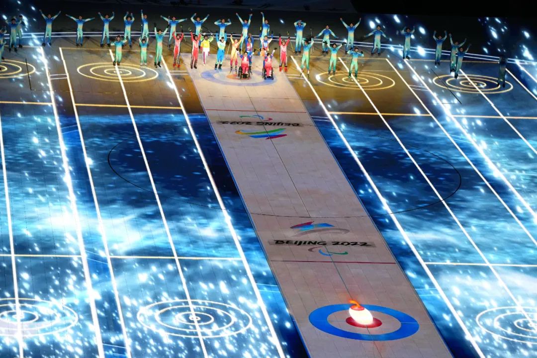 隨著冰壺的擊出,標(biāo)線一格格推進(jìn),從10至1的倒計(jì)時(shí)數(shù)字在場(chǎng)中心賽道上顯現(xiàn)。當(dāng)時(shí)間歸零,冰壺穩(wěn)穩(wěn)進(jìn)入圓心。在全場(chǎng)的歡呼聲中,一屆無與倫比的冬殘奧會(huì)拉開大幕。
