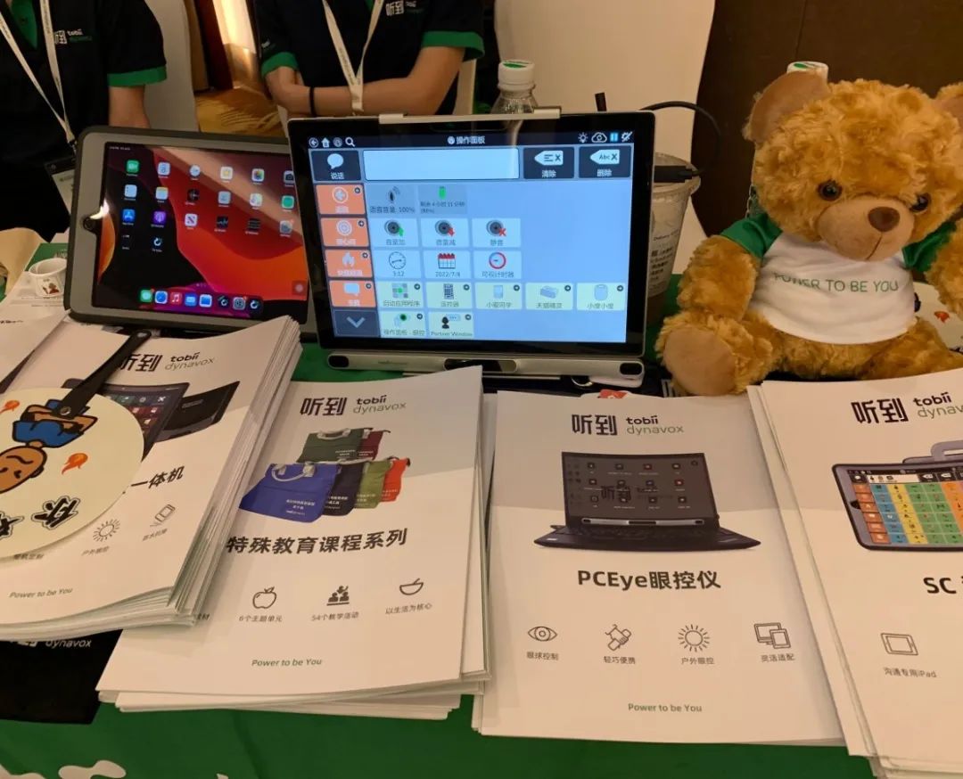 在研討會(huì)的“新技術(shù)新應(yīng)用展示交流”環(huán)節(jié),參會(huì)代表駐足詢問(wèn)及體驗(yàn)了現(xiàn)場(chǎng)展示的高科技輔具,包括AAC溝通輔具、眼控設(shè)備、多媒體康復(fù)教室、自閉癥障礙評(píng)估、聽力言語(yǔ)智能學(xué)習(xí)助手、集體康復(fù)智慧屏、兒童康教訓(xùn)練室的整體設(shè)計(jì)方案等,相互間進(jìn)行了深入互動(dòng)及溝通交流。