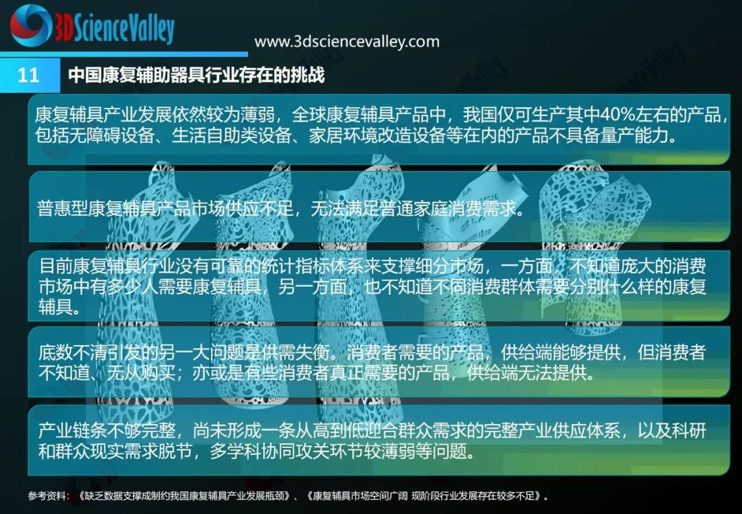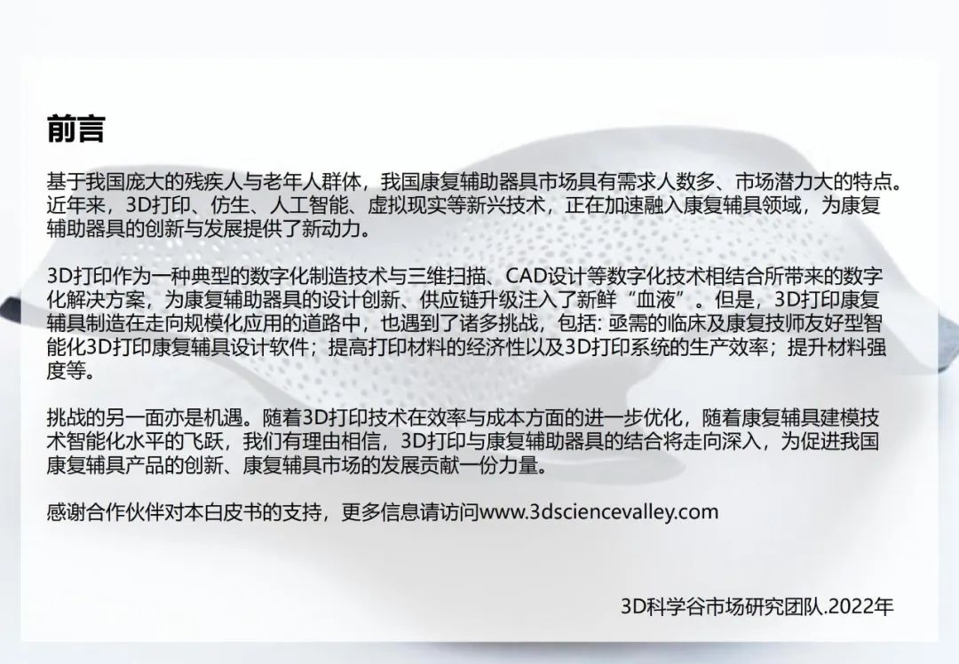3D科學谷第三版《3D打印與康復輔助器具白皮書》,從康復醫(yī)療市場、多樣化的3D打印康復應用、康復輔具設計及行業(yè)標準三大版塊,剖析康復輔具市場前景、挑戰(zhàn),3D打印技術與康復輔具制造的應用結合點,以及推動3D打印康復輔具應用走向深入的積極因素。