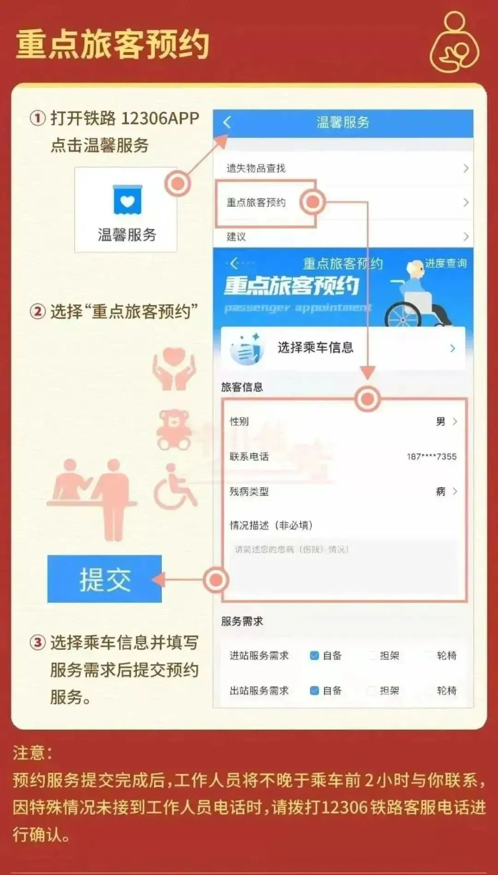 重點(diǎn)旅客預(yù)約服務(wù)僅受理依靠輪椅、擔(dān)架等輔助器具旅行的老年、傷病、殘疾等已購車票旅客服務(wù)需求。