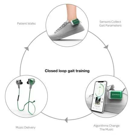 該數(shù)字療法的使用者需要將傳感器夾在鞋子上,戴上耳機即可開始與專業(yè)音樂治療師的視頻會話。傳感器收集患者的基線步態(tài)數(shù)據(jù),算法持續(xù)接收來自傳感器的實時數(shù)據(jù),根據(jù)用戶數(shù)據(jù)實施臨床干預措施。患者聽著音樂隨著節(jié)拍行走,算法不斷評估患者行走能力并提供聽覺刺激。除了數(shù)字療法外,MedRhythms還提供遠程的神經(jīng)音樂療法,主要面向腦損傷、阿爾茨海默癥、帕金森癥、發(fā)育障礙和多發(fā)性硬化癥,通過音樂療法幫助患者恢復語言、行動、認知等方面的能力。