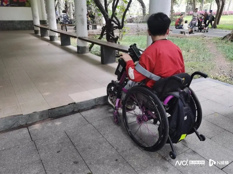 而在天河公園走訪時(shí),殘障市民馮先生能夠順利駕駛輪椅從主干道進(jìn)入一處名為“粵秀園”的景點(diǎn),但走了沒多遠(yuǎn),一個(gè)高約5厘米的臺(tái)階令他無法再前進(jìn)。