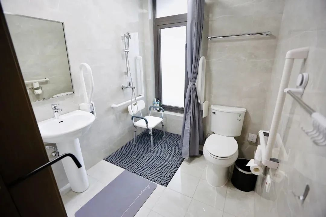 房間內(nèi)配備無(wú)障礙衛(wèi)生間,衛(wèi)生間的門拓寬至80厘米,方便輪椅通行,1.5米的寬度可以使輪椅在里面輕松調(diào)頭,洗手臺(tái)盆高度75厘米,鏡子都有前傾和后仰角度,坐在輪椅上,也可以輕松照鏡子。淋浴區(qū)的扶手及座椅、洗漱臺(tái)兩側(cè)的可調(diào)節(jié)扶手,讓殘障人士可以輕松使用;室內(nèi)的垃圾桶在色彩選擇上,采取藍(lán)黑配色,方便色弱人群可以輕松辨別垃圾桶對(duì)應(yīng)的垃圾種類,進(jìn)行垃圾分類。